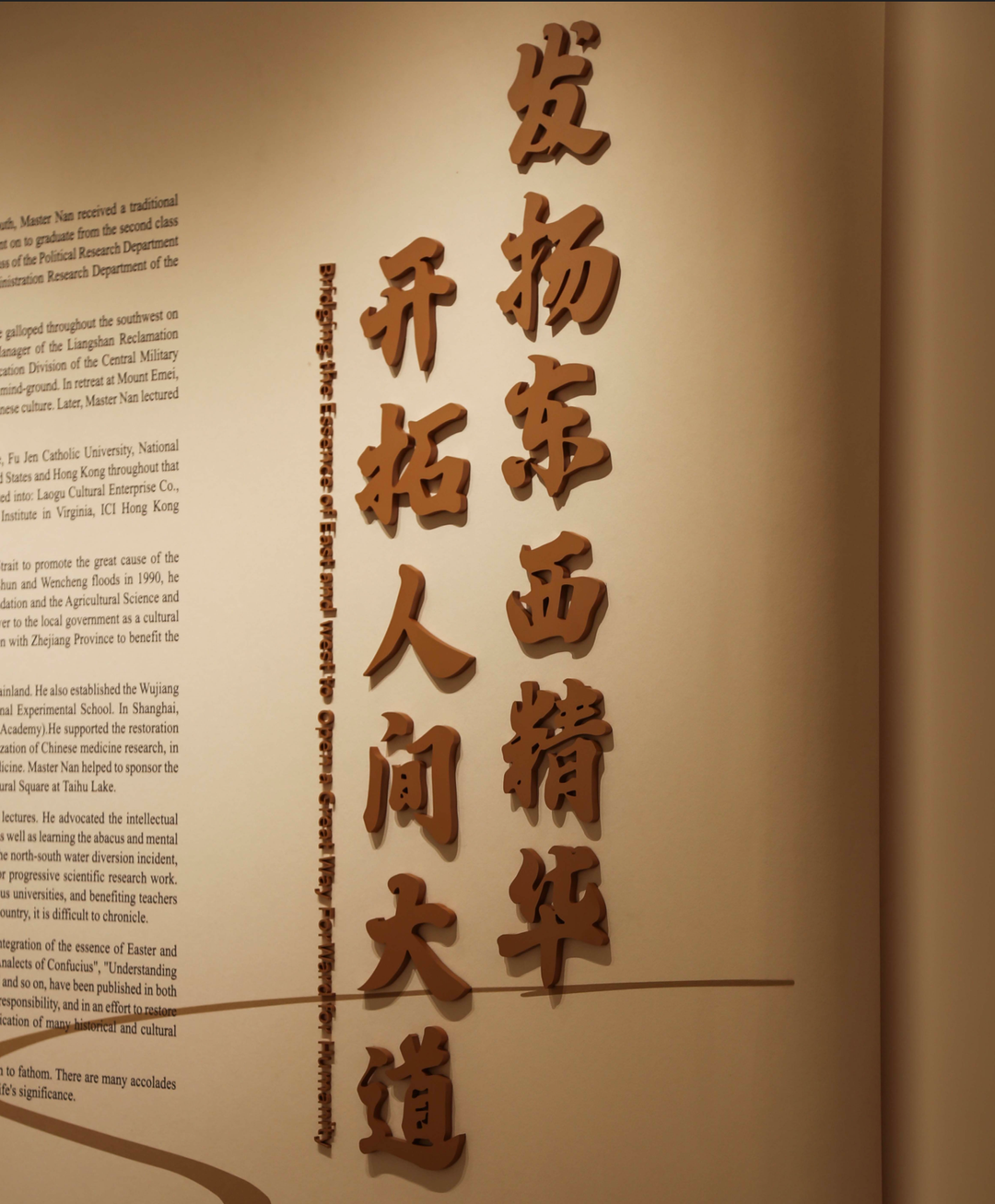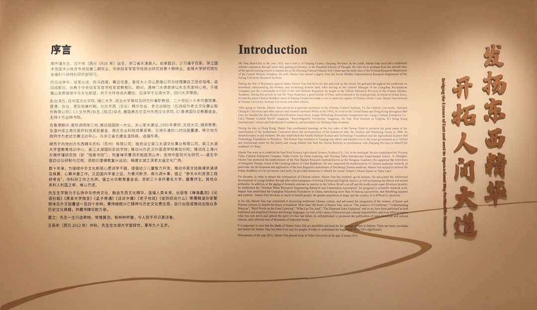 南怀瑾先生,戊午年(西元1918年)出生,浙江省乐清县人。幼承庭训,少习诸子百家。浙江国术馆国术训练员专修班第二期毕业,中央陆军军官学校政治研究班第十期修业,金陵大学研究院社会福利行政特别研究部研习。