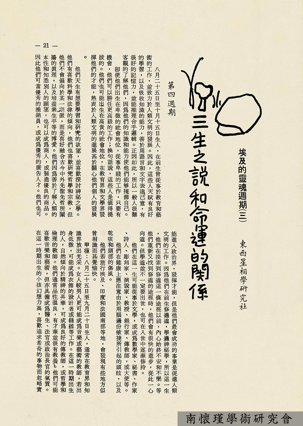 南怀瑾先生在创办东西精华协会初期,为配合协会宗旨,融汇交流东西方文化思想,复兴中国学术文化,努力于文化工作的潜移默化,在人力、财力双重困境下,毅然决然地创办了《人文世界》杂志社,1971年5月创刊号(月刊)问世。从即日起,每周二、四,我们连载《人文世界》杂志文选,供研究南怀瑾先生生平与学术思想者参考。