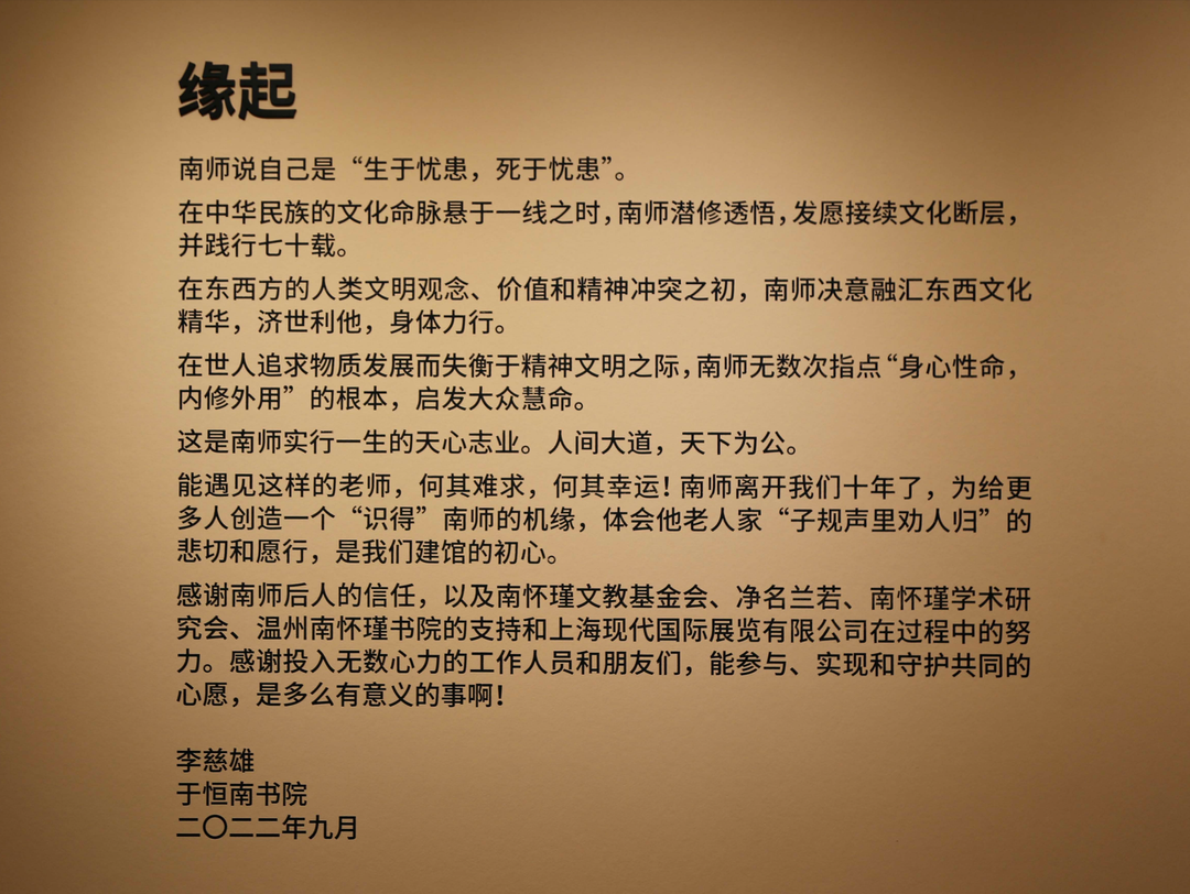 感谢南师后人的信任,以及南怀瑾文教基金会、净名兰若、南怀瑾学术研究会、温州南怀瑾书院的支持和上海现代国际展览有限公司在过程中的努力。感谢投入无数心力的工作人员和朋友们,能参与、实现和守护共同的心愿,是多么有意义的事啊!