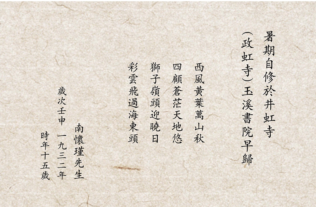 这首诗是写景的,也是实在的,我常常回家去拿菜,很早就下山了,拿菜回来,碰到太阳刚刚出来,山上庙子到我家之间有个山坡,叫狮子山,所以说“狮子岭头迎晓日”,天刚亮,“彩云飞过海东头”,这是十五岁所作的那首诗,所以我们家乡有些同学都记得。