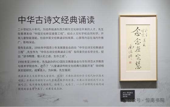 二十世纪九十年代,为培养融通东西方精华文化继往开来的人才,先生在香港发动“中国文化断层重整工程”,结合人文科学和自然科学,开发儿童智能潜能,包括中英文经典诵读和珠算、心算等内容在海内外推广,影响深远。
