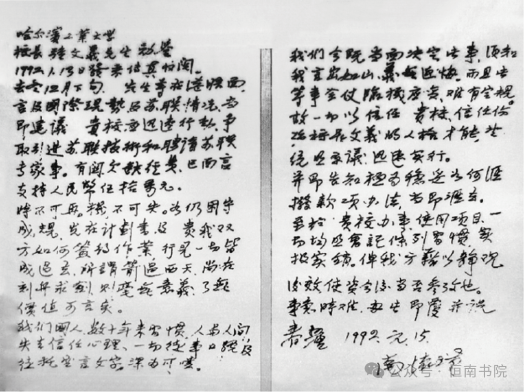 在1991年12月哈尔滨工业大学强文义副校长来访之际,先生根据当时苏联解体的国际形势,希望哈工大抓紧时机引进苏联科技人才与技术,并愿捐助此事,随后即捐助首笔资金8万美元。