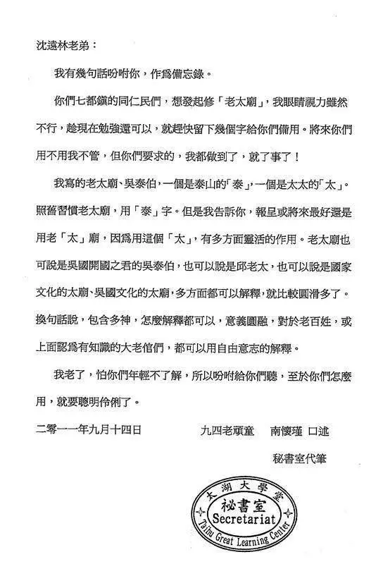 先生题字,并就题字缘由专函说明捐赠重建老太庙