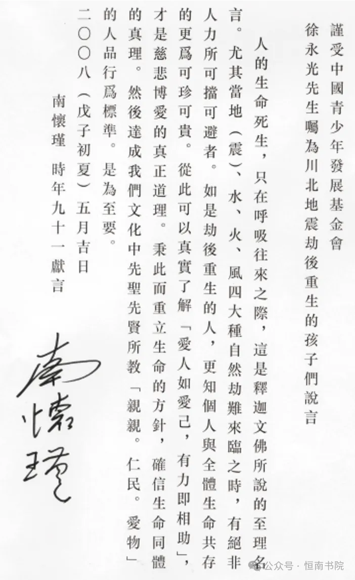 汶川地震,先生给劫后重生的孩子们写信(收录在《幸存下来就要好好活下去》):人的生命死生,只在呼吸往来之际,这是释迦文佛所说的至理名言。尤其当地(震)、水、火、风四大种自然劫难来临之时,有绝非人力所可挡可避者。如是劫后重生的人,更知个人与全体生命共存的更为可珍可贵。从此可以真实了解“爱人如爱己,有力即相助”,才是慈悲博爱的真正道理。秉此而重立生命的方针,确信生命同体的真理。然后达成我们文化中先圣先贤所教“亲亲,仁民,爱物”的人品行为标准。是为至要。