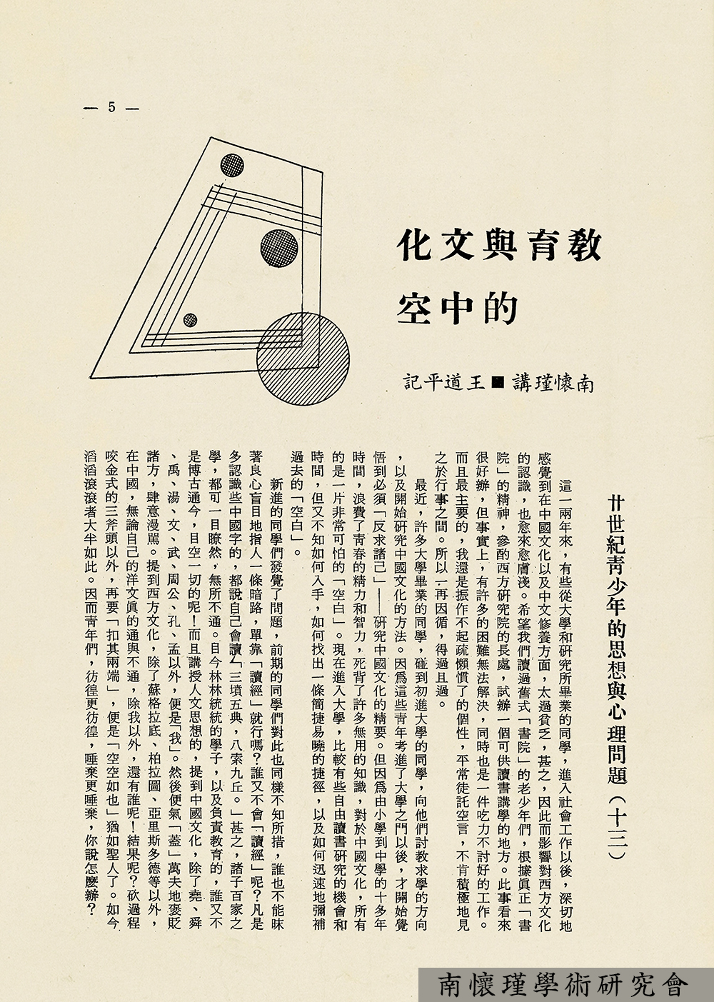南怀瑾先生在创办东西精华协会初期,为配合协会宗旨,融汇交流东西方文化思想,复兴中国学术文化,努力于文化工作的潜移默化,在人力、财力双重困境下,毅然决然地创办了《人文世界》杂志社,1971年5月创刊号(月刊)问世。从即日起,每周二、四,我们连载《人文世界》杂志文选,供研究南怀瑾先生生平与学术思想者参考。