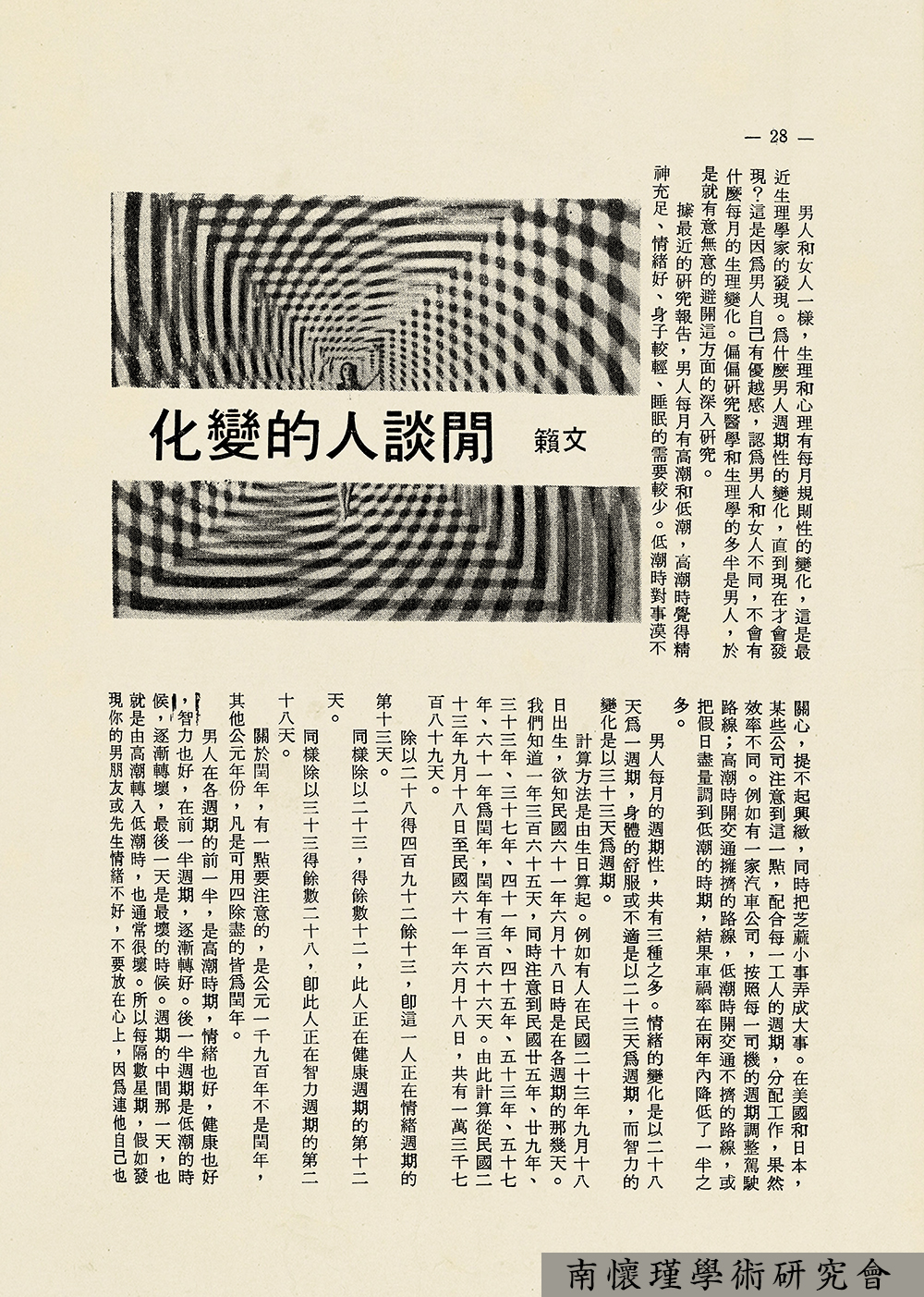 南怀瑾先生在创办东西精华协会初期,为配合协会宗旨,融汇交流东西方文化思想,复兴中国学术文化,努力于文化工作的潜移默化,在人力、财力双重困境下,毅然决然地创办了《人文世界》杂志社,1971年5月创刊号(月刊)问世。从即日起,每周二、四,我们连载《人文世界》杂志文选,供研究南怀瑾先生生平与学术思想者参考。