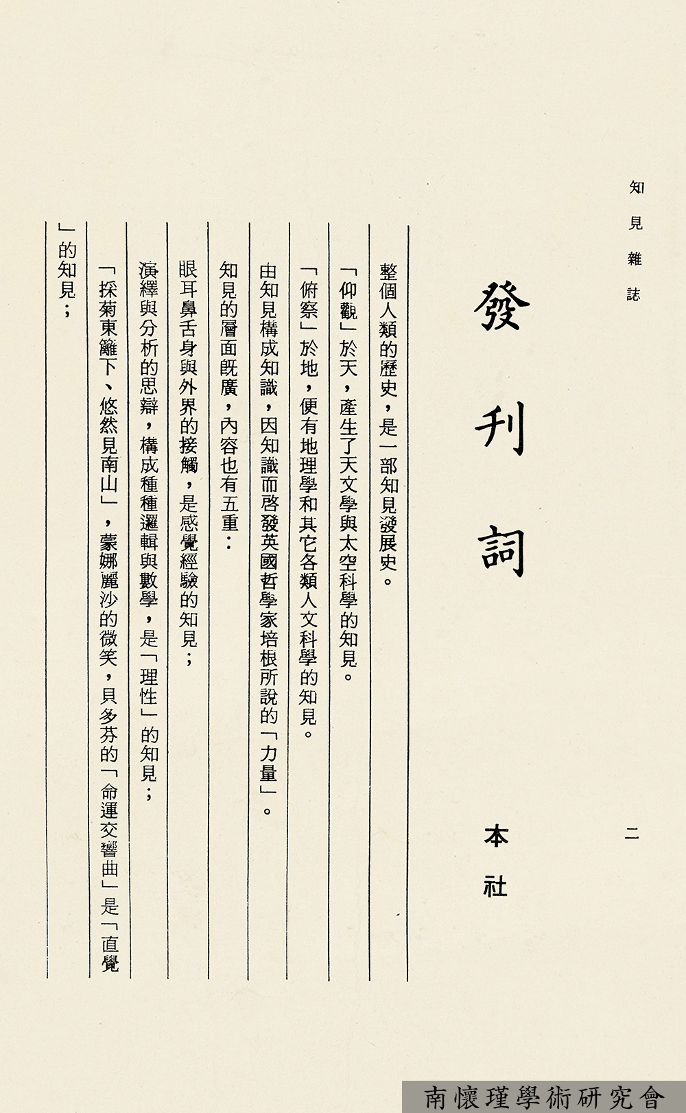 从即日起,连载《知见》杂志文选,供研究南怀瑾先生生平与学术思想者参考。 刘雨虹老师在《禅门内外》中记载:“说起《知见》,本来是从智法师所创办,由于稿件多由老师这边提供,后来索性老师接手,一方面老师也希望从智师专注于佛法的修持。《知见》由老师接手后,蔡策和陈世志都是基本干部。”
