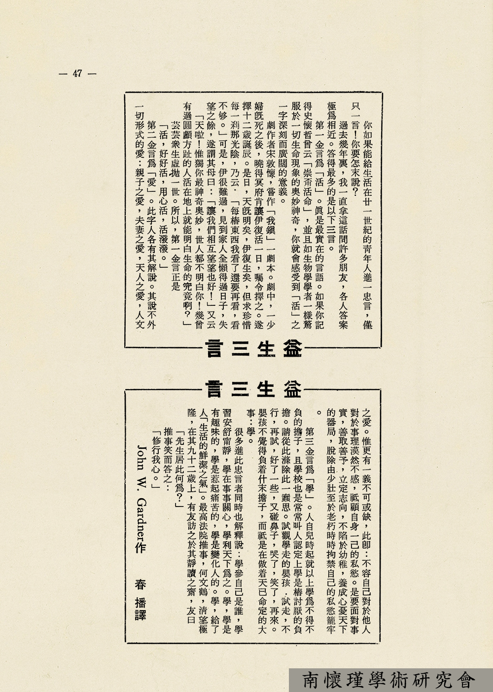 南怀瑾先生在创办东西精华协会初期,为配合协会宗旨,融汇交流东西方文化思想,复兴中国学术文化,努力于文化工作的潜移默化,在人力、财力双重困境下,毅然决然地创办了《人文世界》杂志社,1971年5月创刊号(月刊)问世。从即日起,每周二、四,我们连载《人文世界》杂志文选,供研究南怀瑾先生生平与学术思想者参考。