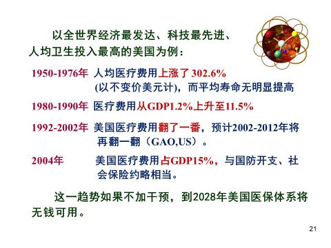 我们拿全世界经济最发达、科技最先进、人均卫生投入最高的美国来做一个例子。从1950年到1976年的二十五年的时间里,差不多四分之一世纪,人均的医疗费用上涨了百分之三百零二,这还没有算物价上涨,通货膨胀的因素。在1980年到1990年十年中间,美国医疗费用占GDP的比重从百分之一点二上涨到百分之十一点五,上涨了十倍还多,那么现在美国的医疗费用占整个国家GDP的百分之十七到十九。美国这么庞大的一个经济体,它的六分之一到七分之一是用在医疗上,这是非常沉重的负担。