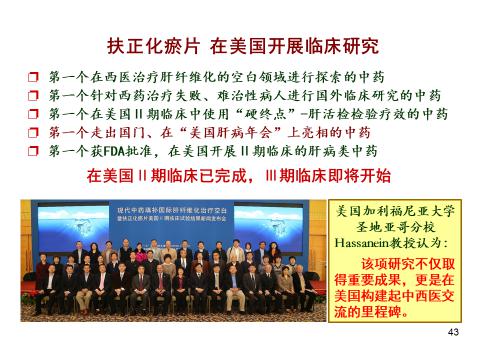 还有《扶正化瘀方》来治疗肝纤维化。中国是乙肝的大国,乙肝变成纤维化,变肝硬化,变肝癌,中国的肝癌也是世界上最多的。西医现在没有好药治疗肝纤维化,中医药的例子是一个非常好的贡献。在美国也进行了二期临床,已经结束了,现在在美国要进行三期临床,国内已经上市了。