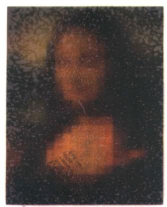 我现在请各位把眼睛放到中间,我要给你们看一张图。你看到的时候不要想,要马上告诉我那是什么。准备好,对,你们每个人都说是蒙娜丽莎。我真的跟你强辩,我说是蒙娜丽莎的妹妹。你看不见脸,所以没有办法说她是谁。但是把这张图拿去给非洲,不曾看过蒙娜丽莎的人,看了老半天,他说“两坨牛粪”。你说这是人脸,他看不出来。因为这张图90%的信息已经洗掉了,只有10%。对一个曾经看过的人来说,10%就足够了,一眼看过去马上说蒙娜丽莎。各位了解背景知识的重要性了,它让你在很短的时间之内,看到你应该看到的东西。所以我们常讲,假如你今天有误会,你要面对那个人去解决,而且人生是不停地做选择,假如你碰到一个难以决定的选择,那么你不管选什么都是一个好的选择。
